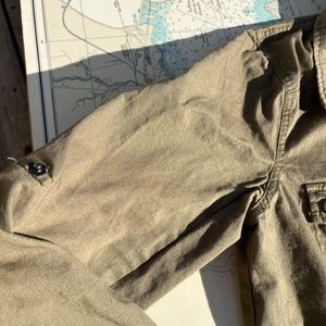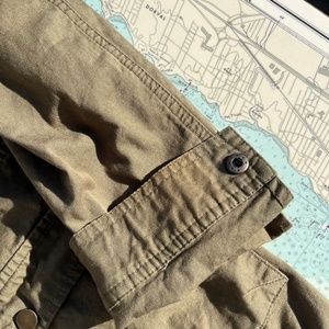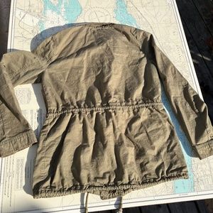 Just fab zippered army green cotton jacket. Great closet staple! Large pockets with drawstrings at waist and hips. Has some odd colour variations/ fading, only visible if you're really looking for them, see photos. Tagged as a medium, measures 15" across shoulders, 18" pit to pit, 27" long.