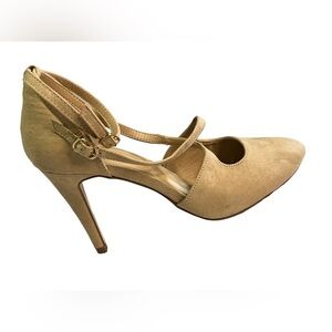 Cute tan high heel sandals with straps that go around your ankle with a small buckle closure.