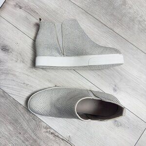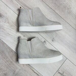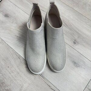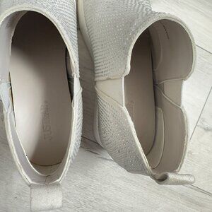 JustFab white slip-on fashion sneakers, Deena size 8.5. Knit shimmer design, studded and iced out with rhinestones. Casual yet stylish, perfect for adding sparkle to any outfit. Lightly used.