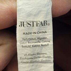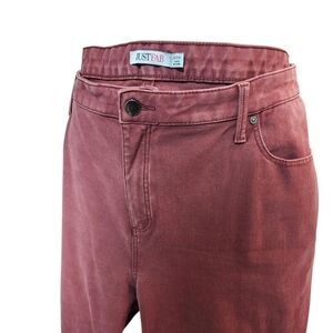 Just Fab jeans with stretch. The color is red/rust/brown shade.