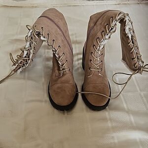 Just Fab Asher Sherpa-Lined Lace-Up Heel Boots Taupe 8.5