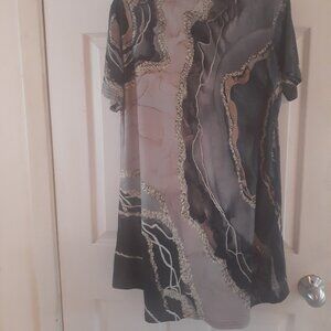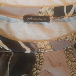 Just Fashion Now Dress, short sleeve and in a abstract pattern. Pre-owned and in great condition. Stylish short sleeve dress. There are multiple colours within this abstract patterned dress. Various shades of brown, grey and a deep olive green. Also black and a bit of white. Dress hangs 35 inches at the back and 32 inches at the front. Looks amazing with black tights! Dress is 100% polyester.