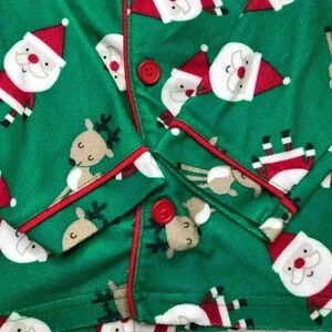 Green in colour with adorable Santa and reindeer pattern on both the shirt and pants.