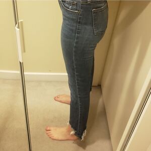 Mid rise dark blue denim 5 pocket skinny jeans with distressed torn cuffs, by JUST BLACK.