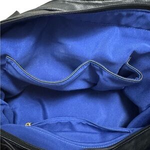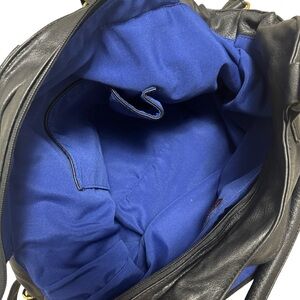 Chic and functional JustFab satchel bag in black faux leather with striking gold-tone hardware. Features dual top handles, an adjustable/removable shoulder strap, and front zipper/pocket accents for a modern look. Spacious interior lined in bold cobalt blue with zippered and slip compartments for organization.