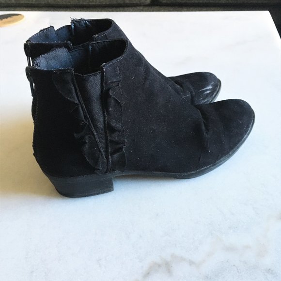 JustFab super cute flat black Chelsea boots with ruffles along the side stretch panels!