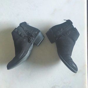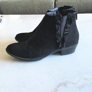 Super cute flat black Chelsea boots with ruffles along the side stretch panels!