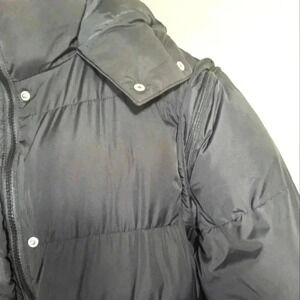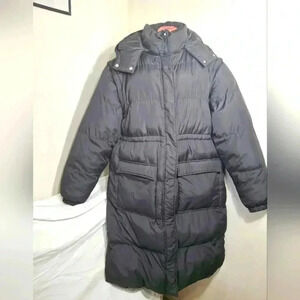 JUSTFAB giant long warm winter coat, sleeves zip off to make a vest, very large hood, waist cinch cord. I am 5'2" and it goes to my ankles. perfect for the ice rink and arenas, worn once, excellent new condition.