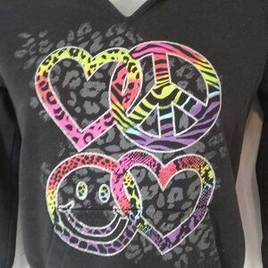 Justice Black Fleece Hoodie Sweatshirt Glitter Heart Peace Happy Face Girls 7-8