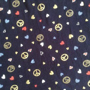 - Fabric is midnight blue with gold peace signs and small hearts in multiple colours