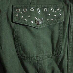 "Stay stylish and cozy with this Justice girls' green utility jacket featuring a hood for added warmth and functionality.