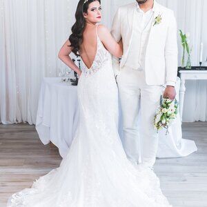 This glitzy fit and flare wedding dress features a sexy bikini neckline accented with tonal beaded spaghetti straps that lead to an open V-back. Beaded appliqués adorn the entire gown with a sequined glitter tulle underlay that pops. This style has a jersey lining that contours the body, while a chapel-length train completes the look.