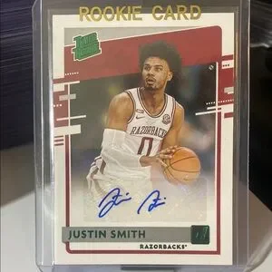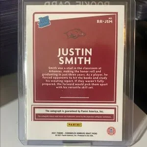 Rookie card featuring Justin Smith. Includes signature. Razorbacks theme with red and white design.