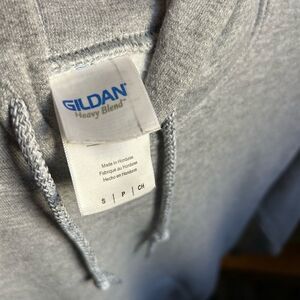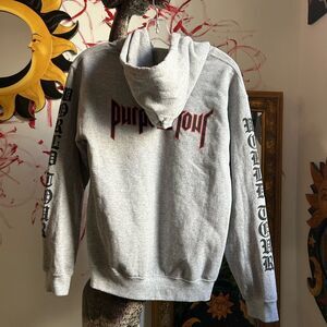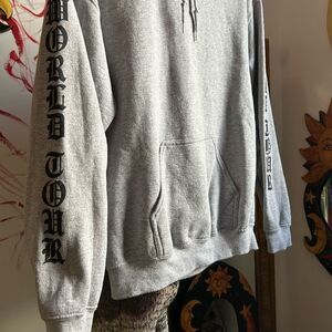 Stylish heather gray hoodie. Bold 'World Tour' text on sleeves. Ideal for casual wear. Some stains.