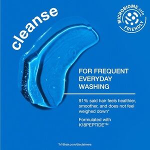 A color-safe, pH-optimized shampoo with the patented K18PEPTIDE™ to effectively cleanse while maintaining hair health and protecting hair from damage. pH-optimized formula helps reduce excess swelling of the hair cuticle during washing to help prevent frizz, preserve color, and enhance shine. Scalp microbiome-friendly and gentle enough to use every time you cleanse.