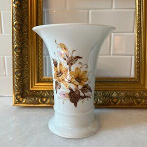 A stunning vintage 1960s porcelain vase by Kaiser designed for the Arlette collection by K. Nossek. This stunning vase is in excellent vintage condition and features a gorgeous floral design in gold, brown, taupe and pink. An incredible example of West German pottery/ceramics.