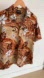 Kai-Veikau short sleeve button front shirt made in Fiji. Brown, red, light yellow and white design with tropical flowers. Front pocket. Box pleat at back. Extra button on side seam. 100% cotton.
