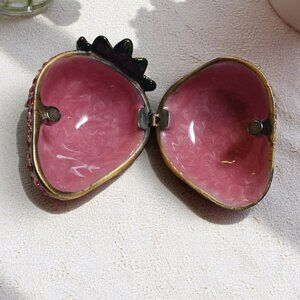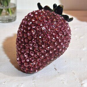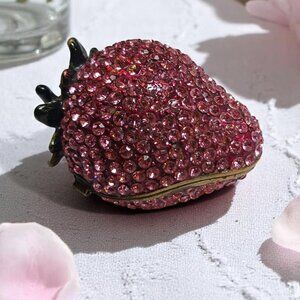 Add elegance and whimsy to your vanity with the KALIFANO Pink Strawberry Jewelry Box, a handcrafted collectible made with sparkling Swarovski Element crystals and pearlized enamel glaze. This vibrant pink strawberry design hides a secret hinged compartment, perfect for storing rings, earrings, stones, or keepsakes. Whether displayed on a desk, dresser, or shelf, the hand-set crystals deliver a dazzling shine that catches every eye . Ideal for gift-giving, organization, or as a unique ornament, this 1.75" x 2.75" x 2" treasure and brings luxurious charm to any space. Gift idea, Heirloom-quality Collectible. Very good condition, all crystals seem to be intact. Please see pics.