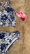 Blue and white tankini bikini with a blue and white floral print and a strappy racerback design. Perfect for a tropical beach family vacation!