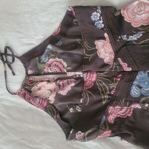 elegant, fitted lady like dress with beautiful neckline, ties at back of neck, zippers up back, skims hips and falls just below knees. Incredibly well made and tailored garment / material tags were removed but luxuriously skims and moves with the body. Rich brown with dusty pink/blue floral print