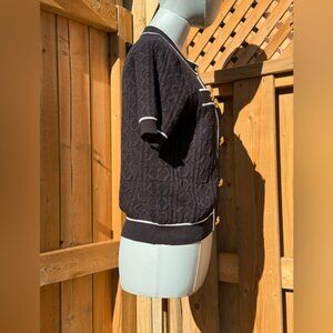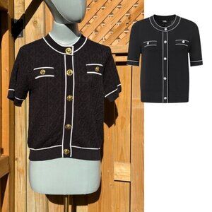 Signature Karl Lagerfeld style, this classic jacquard knitted short sleeve sweater top is perfect for any occasion. Features the Karl Lagerfeld monogram embroidered in the black knit, accented with decorative gold logo'd buttons.