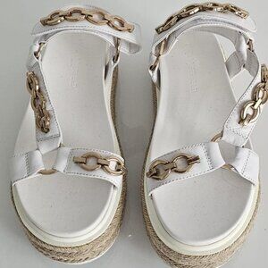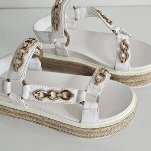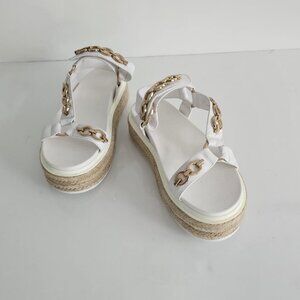 Metal chain along straps; metal rings; rubber welt; natural jute outsole
