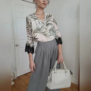 Karl Lagerfeld Paris tropical palm-lined cream and green blouse in size S. Pit to pit 19", length 35". This elegant and vibrant blouse is perfect for adding a touch of tropical flair to your wardrobe.