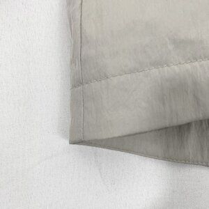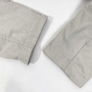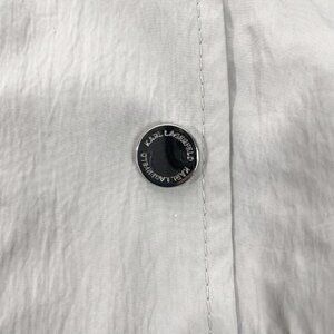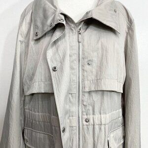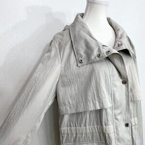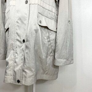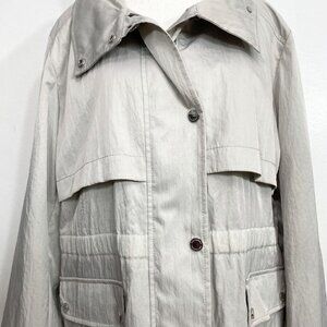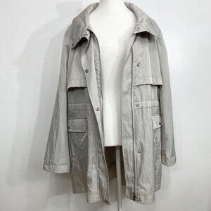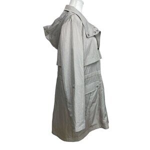 KARL LAGERFELD WOMEN'S GREY SILVER HOODED WIND COAT, this is a grey silver shimmer lightweight zip up buttone hooded wind coat with long rolled tab sleeve - retractable hoodie that can be rolled and hidden in a zipped collar - mock neck / high neck with Karl Lagerfeld designer name engraved in each silver metallic button on the front - pockets mixing buttoned flap pockets and welt pockets for more storage for a convnient feature - slight high low style - lined - perfect for transitory seasons like fall and early spring- comfy - regular fix - utility style with a faux-drawstring style (do not cinched or adjust ) - back fabric layer on the upper back for a trench style. Neutral solid color for a mature contemporary style.