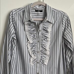 Striped button down shirt with ruffle detail. Feminine features with front and arm ruffle and lace detail, pearlized decorative buttons. Features white with black and pale blue stripes. Button-up design. 100% cotton machine wash cold. A statement blouse to style with a high waist denim jean or trousers. Excellent new condition.