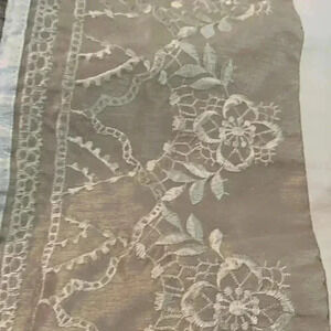 This absolutely gorgeous duvet cover is in excellent condition. It has loads of details making it a very pretty piece. It’s done in green greys, gold and off-white. It has a 6 inch panel of embroidery as well as 16 inches of ruffles in the middle.