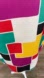 KASPER FOR A.S.L vintage polyester short-sleeved blouse featuring a geometric patchwork pattern in vibrant colors. The pattern consists of squares and rectangles in shades of red, yellow, green, purple, black, and white. It has three back fabric button closure at back of neck. Does have the occasional small snag and a few very subtle marks on front. Removable shoulder pads.
