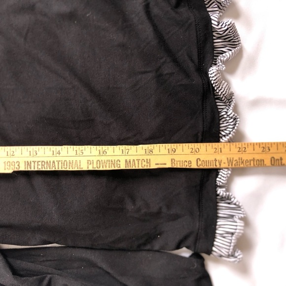 Cute black and white long sleeve top with a stylish design. Perfect for any occasion. Front is black and a tee shirt sort of material and the back is lighter weight and striped white and black. Ruffle detail.