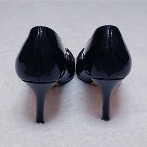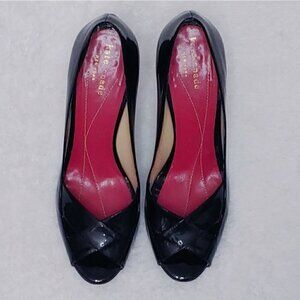KATE SPADE Gwennie, black, patent leather, leather upper, lining and sole, crisscross design open toe, pumps, size 6.5B (Narrow). Great pre-loved condition, a little pleat on one of the shoe ( as shown on the pictures) but almost invisible. The front part of the outsoles on the picture is darker because I cleaned them with a leather cleaner product but they seem to stay like that.. Not visible when your wear them though!