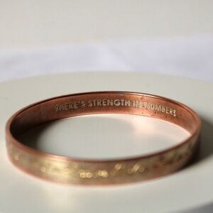 Inspirational Kate Spade New York bangle in a rose gold tone. Outside of bangle has the words "hand in hand" engraved all around and inside of bracelet is engraved with "There's Strength In Numbers" and "Kate Spade New York". Circumference of bracelet is 8.5". Pre-owned but in good condition with signs of wear (patina), as can be seen in pictures. Smoke-free, pet friendly home!