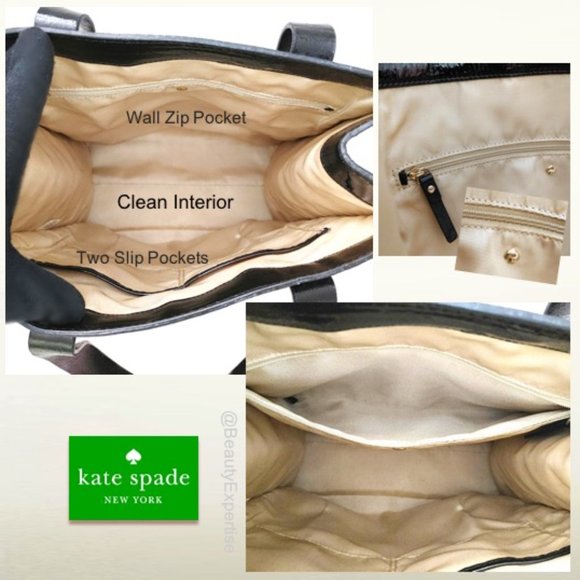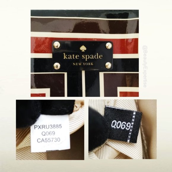 KATE SPADE Tote Book Bag Shopping Travel Bag, Tall Shape, a unique Designer Bag made from Patent Leather Multi-Color Geometric Lined Design in Brown Red Black Beige. Roomy Centre Compartment (can accommodate most of your needs), Zip Wall Pocket, Two Slide Pockets, Beige Satin Lining. Duo Flat Leather Handles for shoulder with 8" drop or carry alone. Sturdy material, great for business, shopping, travel etc.