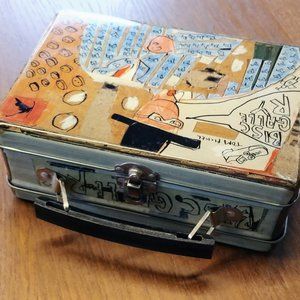 This lunchbox is from 1988. It is in excellent used condition. There is a slight dent in the upper left corner, but it is minor and there is no loss of paint on the exterior. There are a few smudge-like marks, but you have to tilt the piece to see them in reflected light.