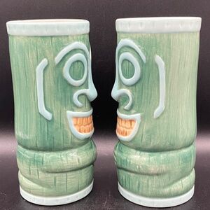 KC Hawaii tumblers x2 ,green ceramic tiki masks, yellow and blue details 2009 USA. Excellent condition. Approximate size: 319g/ea; 15.5cm/6" H x 7cm/2.75" D.