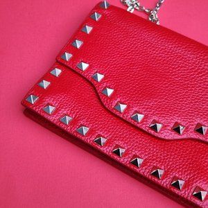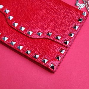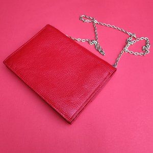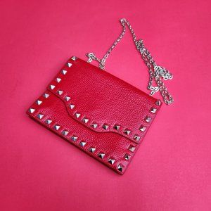 Great small KC Jagger studded red leather purse with long silver chain. It is like new. It is approximately 7 by 5 1/4 inches. Chain is 19 1/2 inches long. Very stylish.