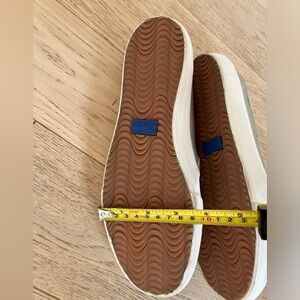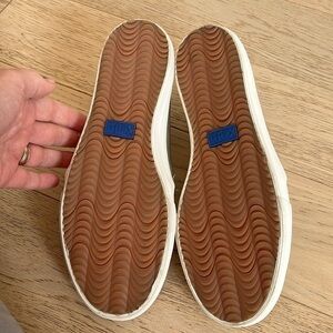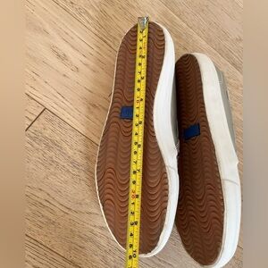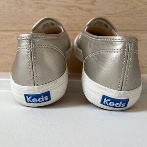 Double Decker Keds are a slip on style with perforated metallic faux leather upper (smooth on sides and back), rubber soles and a dream foam insole for comfort. Metallic silver. Model WF63700.