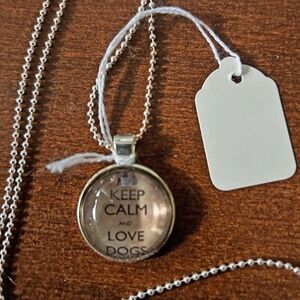 KEEP CALM AND LOVE DOGS PENDANT NECKLACE, HANDMADE, GLASS DOME ON METAL, 23 INCH SILVER-TONE BALL CHAIN, TAG ON