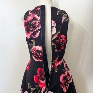 KEEPSAKE THE LABEL BLACK FLORAL SATIN LAYERED COCKTAIL DRESS, This is a super heavy satin high low floral dress for the perfec cocktail / party / wedding guest / bridesmaid happening ! Sleeveless - round neckline - lined - not stretch - fit & flare, it has a bodycon fitted mini skirt with a dramatic a-line layering to create a high-low 2 dimensionnal skirt - fitted upper bodice. Back zipper fastening in a chic black color with vibrant red and pink floral print.