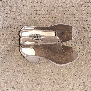 Size 6.5, measures 9.75" via insole, 4" block heel and 3.75" wide