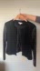 DESCRIPTION: Black Wool Blend Body will Faux Leather Sleeves. Fitted Bomber style. Jacket has a half zip up the bodice and snaps. Scoop neck. Inner Lining.
