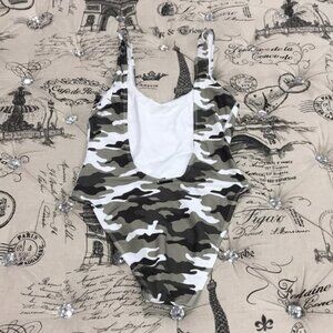 Camo print decorates a low back one-piece swimsuit for a sultry, military-chic look.