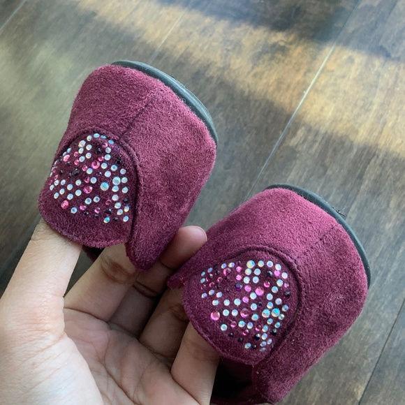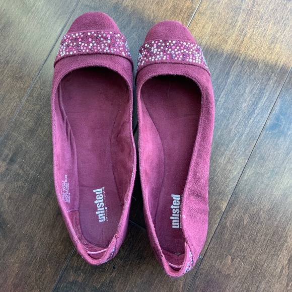 Very comfortable ballet flats in a maroon colour with different coloured rhinestones. In pristine condition worn 1-2 times. Faux suede, very soft and comfortable. Perfect colour for the fall or holiday outfits!