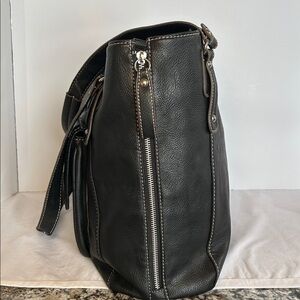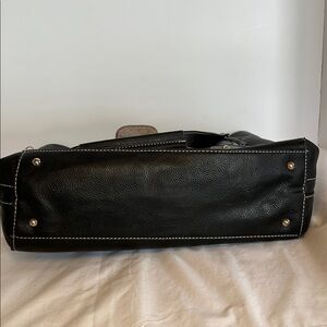 Kenneth Cole Tote black leather bag with silver toned hardware and front plate and contrasting stitching. Two lg compartments, plenty of inside pockets and storage. Side zippers to enlarge tote.