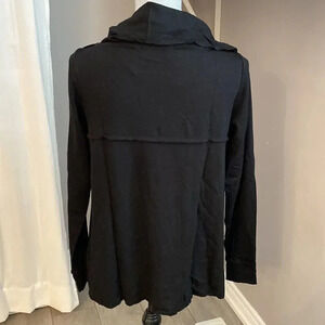 Rayon blend open snap button top with cowl style collar. This top looks like a cardigan with a large collar that can be worn closed to give a turtleneck collar or left open with one button. Perfect for the office or to throw on with jeans. Excellent condition. Size L