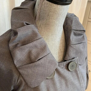 Blazer in grey with bubble sleeves and collar. 2 working side pockets. Style it closed to show off double breasted and large buttons or keep it open. Polyester rayon blend excellent condition. Size 4