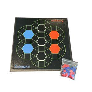 The board is made up of 7 hexes, one in the center and six surrounding. The hexes are joined by squares along the sides, and the squares are joined by triangles. The game is played on the intersections where the lines join. Players play one piece, of their 15, at a time until all pieces are placed, then pieces are moved one at a time from one intersection to another. If a player has a piece at all three of a triangles points, he can reposition any 1 of his opponent's pieces. If a player controls all 4 points of a square, then he can reposition 2 of his opponent's pieces. The object of the game is to control all six points of a hex.
