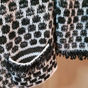 Keren Hart cardigan/open front sweater. Black and white checkered with fringe detail at the neckline, down the front and the cuffs. Two hook and eye clips for front closure near the top. Two pockets.